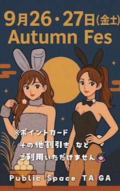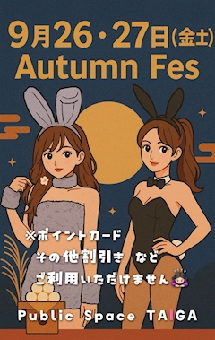 今日明日autumnイベント!🐰 バニーちゃん着るよ!👯♀️っていいたいんだけどさ 猫じゃんね🐱笑笑笑笑笑 まぁええわな、見に来てね❤️❤️ はるか TAIGAは飲み放題🍻 カラオケ無料🎤🎶 🚃 : 各線「名古屋駅」東口より徒歩5分 マップ ⏱ : 19:00-20:00 ¥5500+tax 20:00-24:00 ¥6500+tax 💤 : 日曜日、祝月曜日 📞 : 052-414-7900 飲み放題メニュー🍻 ビール 酎ハイ(レモン、梅) ワイン(赤、白) 焼酎 ブランデー ウイスキー 割り方:緑茶、烏龍茶、水、炭酸 ソフトドリンク🥤 緑茶、烏龍茶、コーヒー、コーラ、 ジンジャーエール、オレンジジュース ♡.*・゚┈┈┈┈┈┈┈┈┈┈┈゚・*.♡ Instagram ほとんど更新してませんが…🥹 TikTok ♡.*・゚┈┈┈┈┈┈┈┈┈┈┈゚・*.♡ 🎀キャスト募集中🎀 アットホームな環境で一緒に働きませんか🫶 詳しくはコチラ⬇️ 求人情報 ♡.*・゚┈┈┈┈┈┈┈┈┈┈┈゚・*.♡ キャスト紹介️📝 👸🏻みう https://sp.pokepara.jp/aichi/m201/a202/shop2314/gal/648941/ 👸🏻まや https://sp.pokepara.jp/aichi/m201/a202/shop2314/gal/264797/ 👸🏻りお https://sp.pokepara.jp/aichi/m201/a202/shop2314/gal/609353/ 👸🏻一条 愛華 https://sp.pokepara.jp/aichi/m201/a202/shop2314/gal/685309/ 👸🏻まなみ https://sp.pokepara.jp/aichi/m201/a202/shop2314/gal/723366/ 👸🏻ひまわり https://sp.pokepara.jp/aichi/m201/a202/shop2314/gal/730719/ 👸🏻あかね https://sp.pokepara.jp/aichi/m201/a202/shop2314/gal/609354/ 👸🏻りん https://sp.pokepara.jp/aichi/m201/a202/shop2314/gal/688016/ 👸🏻きい https://sp.pokepara.jp/aichi/m201/a202/shop2314/gal/708855/ 他にも多数…🫶 ♡.*・゚┈┈┈┈┈┈┈┈┈┈┈゚・*.♡ 出勤情報❤️ はこちら⬇️ 出勤情報