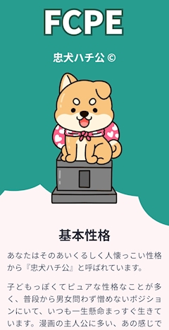最近流行りの 恋愛MBTIみたいなやつやったら 忠犬ハチ公だったよ笑 なんかじわる ちなみに憧れの先輩、隠れベイビー、ボス猫 相性がいいみたい!!! こういう診断大好きだから はまりそう〜🤭 ひまわり🌻